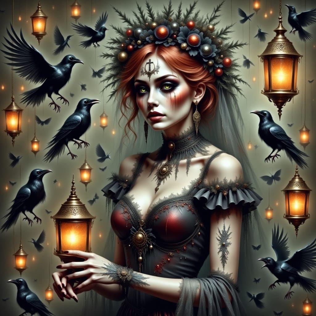 A digital artwork of a fairy witch with red-gold hair, dressed in a dark veil and dress, conducting a seance surrounded by floating lanterns in a cyberpunk aesthetic.