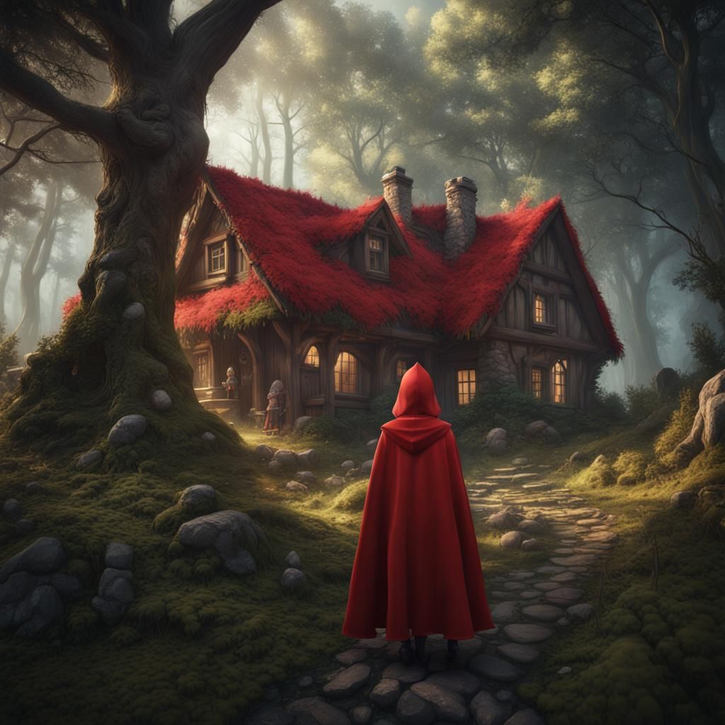 A vibrant digital painting of a girl in a red hooded cape in a forest, accompanied by a bunny near a cottage. The artwork is rich in detail with complementary colors.
