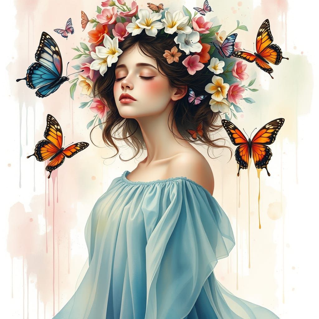 This image shows a serene young woman with closed eyes, adorned with butterflies and flowers, against a dreamy watercolor backdrop. The image is reminiscent of art nouveau.