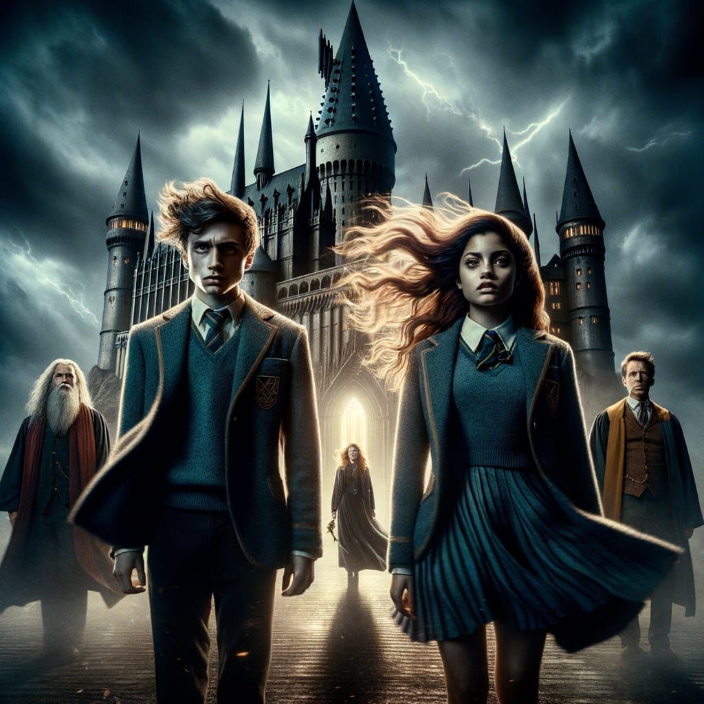 This image shows a magical school castle under a stormy sky, with four figures in the foreground. The scene is reminiscent of a cinematic film still, with vintage camera effects and dramatic lighting.