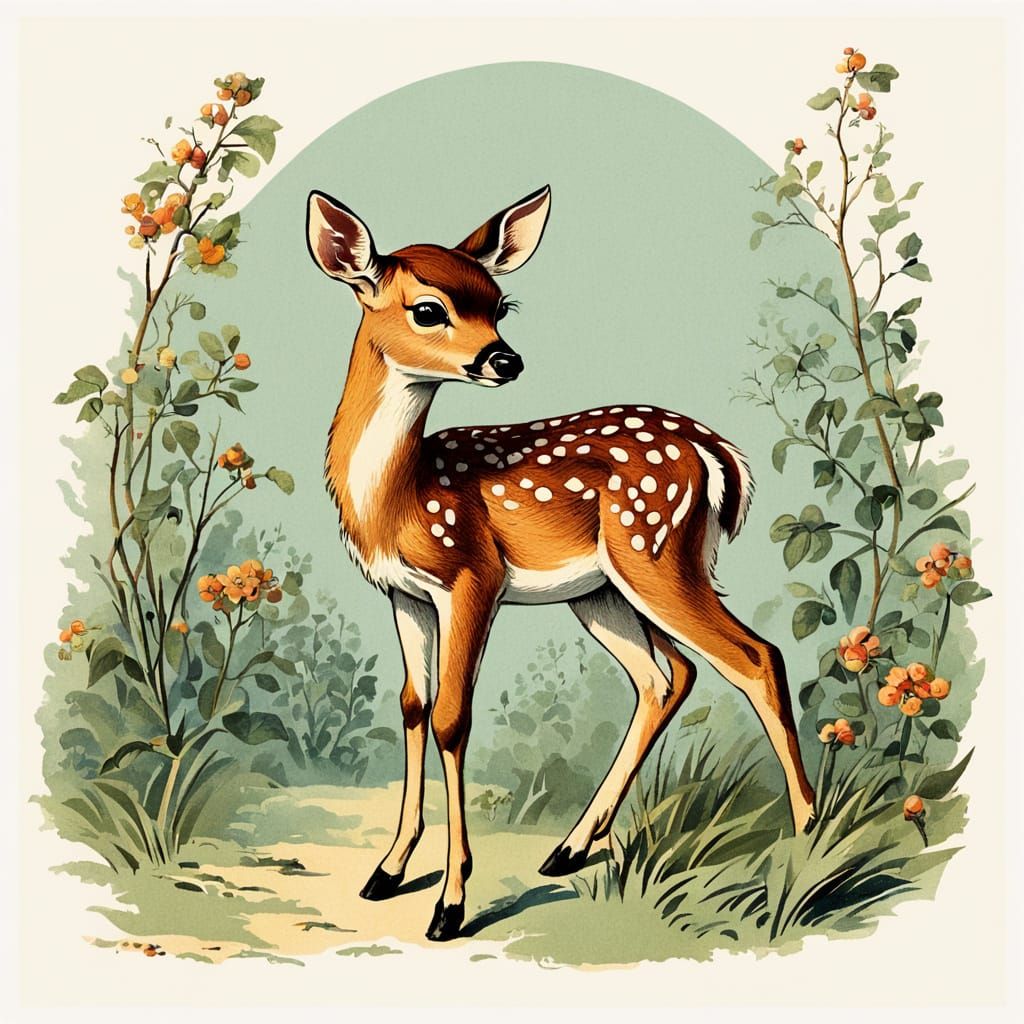 This image shows a vintage illustration of a fawn. The artwork evokes a sense of nostalgia with its classic style and detailed rendering of the young deer.
