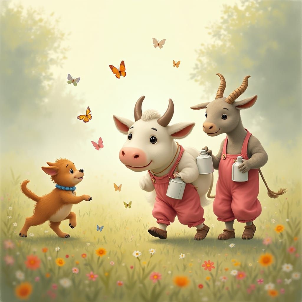 A delightful image showing a puppy chasing butterflies near an anthropomorphic cow and goat in sarees carrying milk. The scene is bathed in soft light and subtle fog, reminiscent of pastoral art.