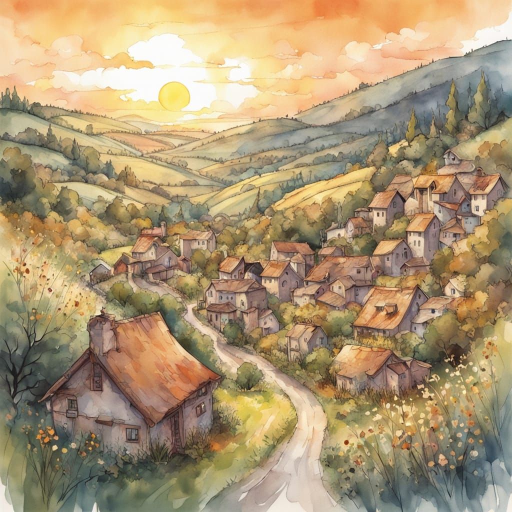 This image shows a quaint village set amidst rolling hills, bathed in warm golden light with vibrant gardens and blooming flowers, evoking a sense of nostalgia and enchantment.
