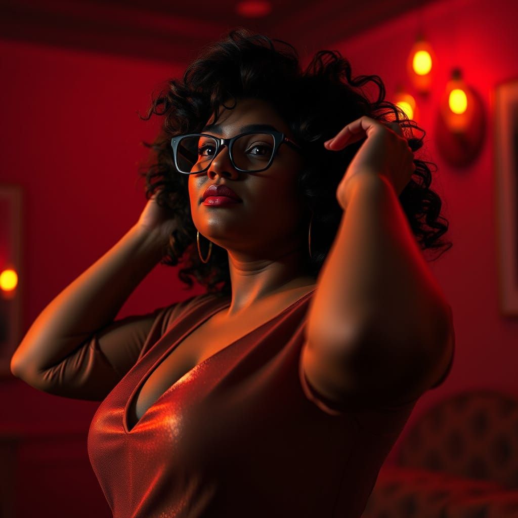 This image shows a curvy Indian woman with glowing skin and curly hair, confidently posing in a dimly lit room. The portrait features dynamic lighting and a 3D cinematic aesthetic.