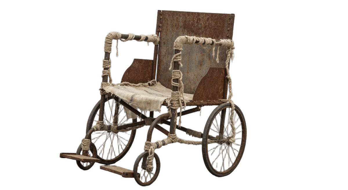 A striking picture of a fragmented wheelchair constructed from rusted metal and rough wood. The piece features asymmetrical wheels and is bound with torn fabrics and rope, in an outsider art style.