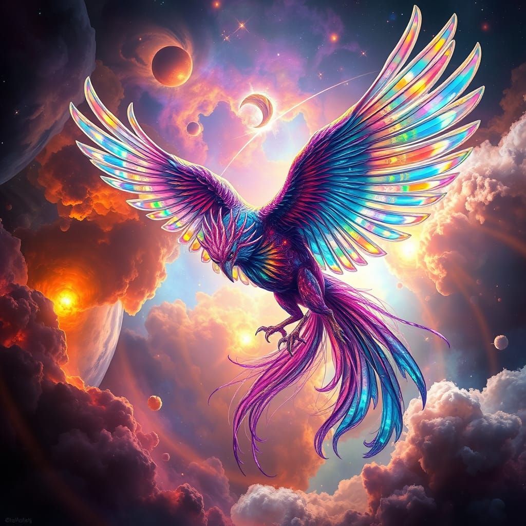 A majestic glass phoenix soars through a nebula painted with vibrant, swirling colors. The phoenix's feathers shimmer with iridescent light, casting a rainbow of colors across the cosmic canvas. The nebula is filled with swirling clouds of gas and dust, creating a sense of depth and mystery. The scene ...