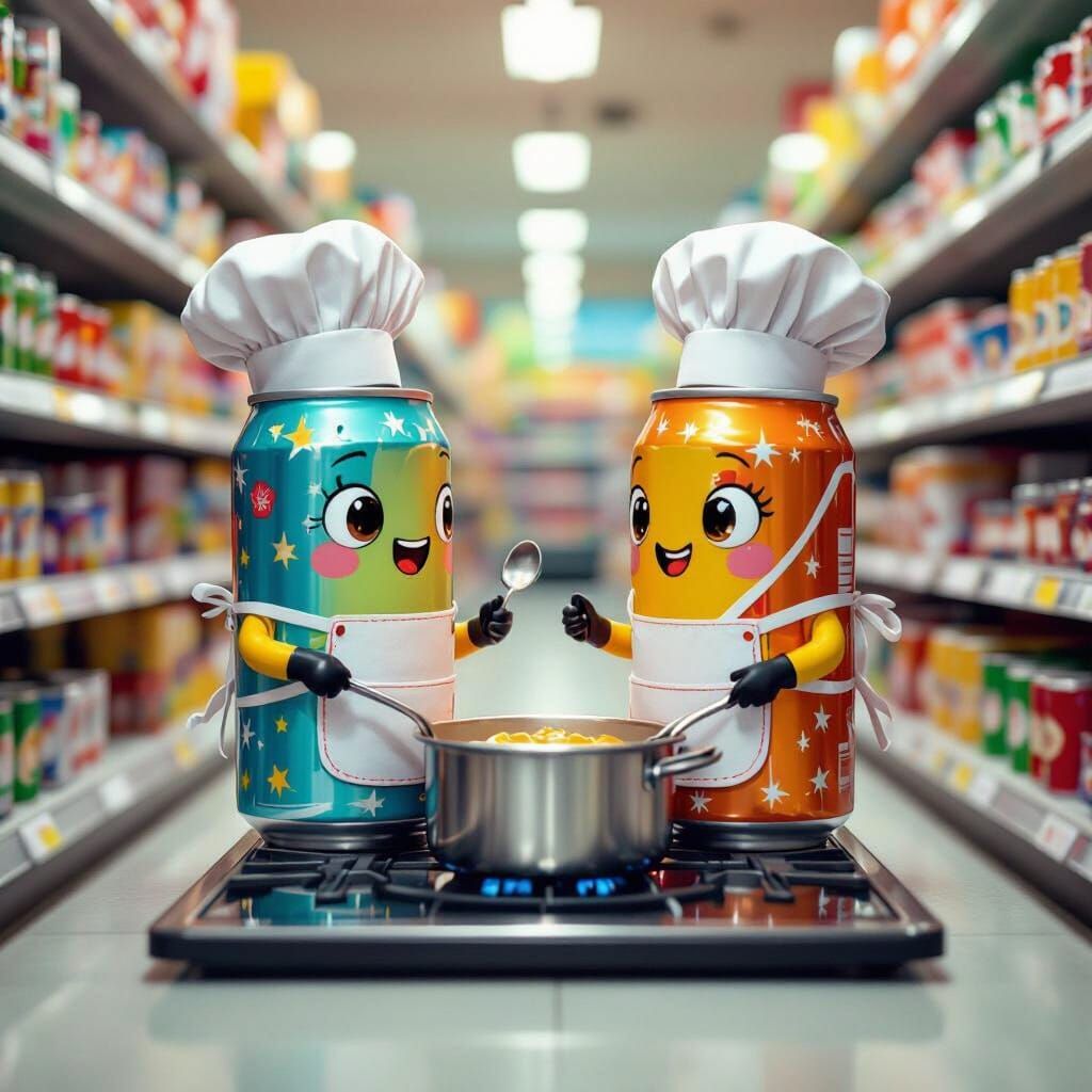 This image shows anthropomorphic soda cans dressed as chefs, cooking in a brightly lit supermarket. The digital artwork features vibrant colors and playful textures.