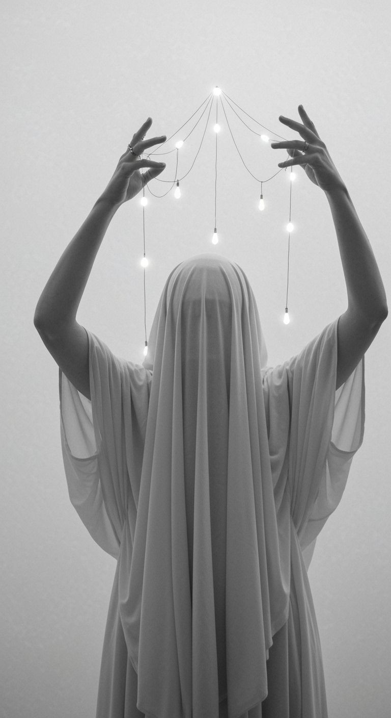 This image shows a pale, faceless woman standing barefoot on misty ground. Dark, root-like patterns surround her, and her head is covered with a translucent white veil. Inspired by spiritual symbolism.