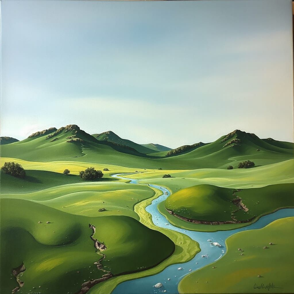 A surreal landscape with melting elements in an oil on canvas style. The piece features a wide, dreamlike vista with green and pale blue hues, rendered as surrealist digital art.