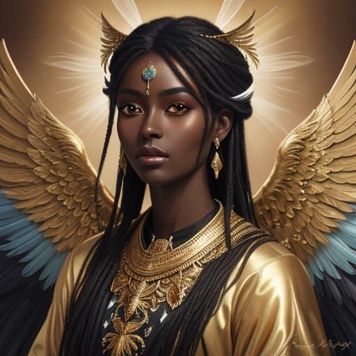 This image shows a close-up portrait of a dark-skinned angel with iridescent feathered wings and a soft halo. The vibrant oil painting style and warm golden colors create a divine, heavenly fantasy art piece.