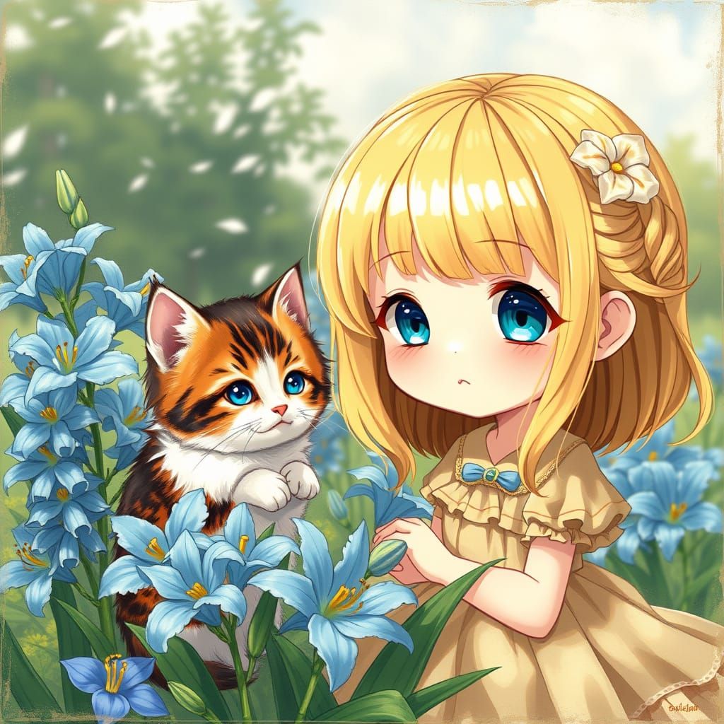 This image depicts a young anime girl surrounded by vibrant blue lilies, sitting with her adorable chibi kitten in a serene sunny garden scene, reminiscent of the beautiful and detailed works of the Pre-Raphaelite movement