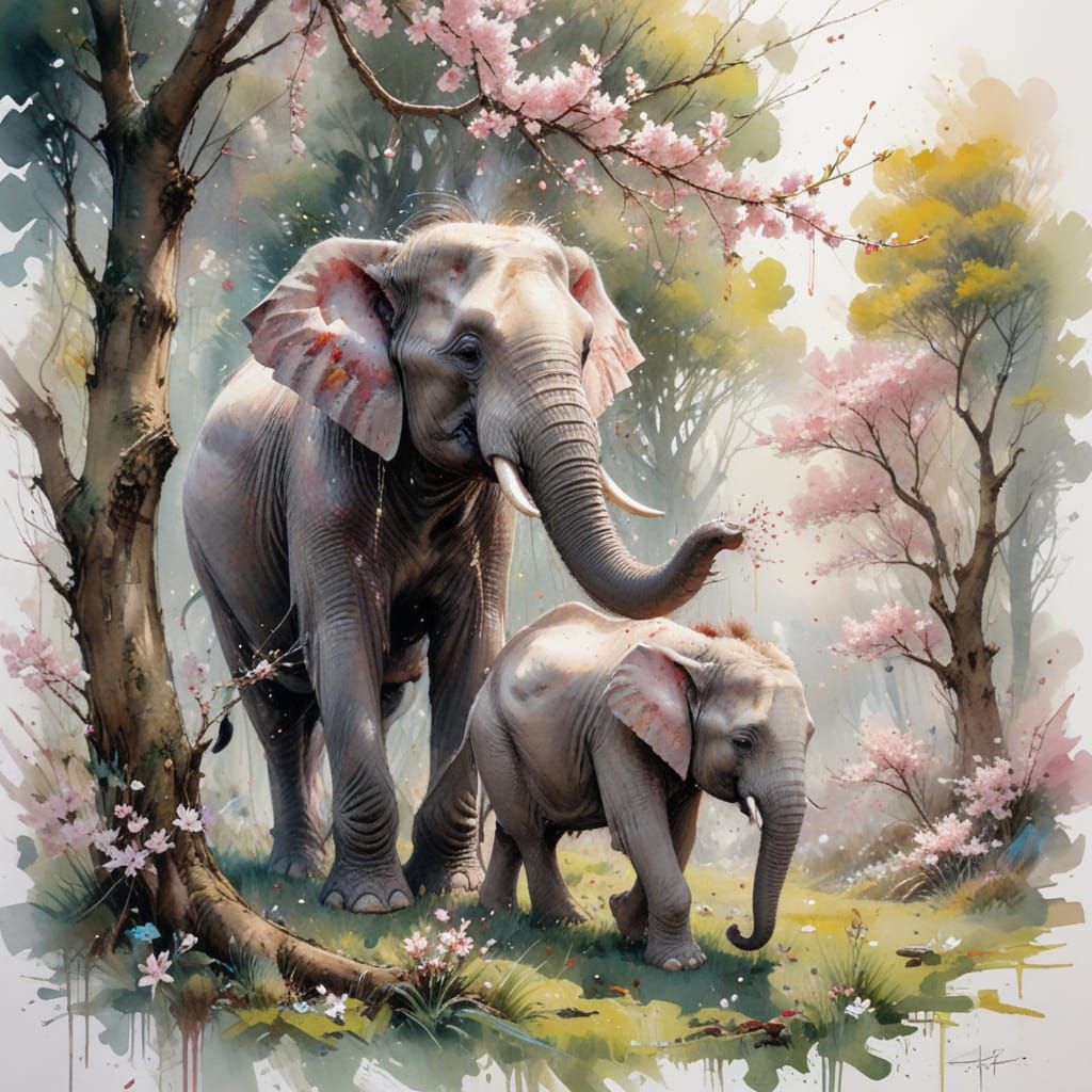 This image shows a towering elephant calf in an ancient orchard, reaching for cherry blossoms. Soft light illuminates the scene, enhanced by expressive watercolour techniques and cinematic stylization.