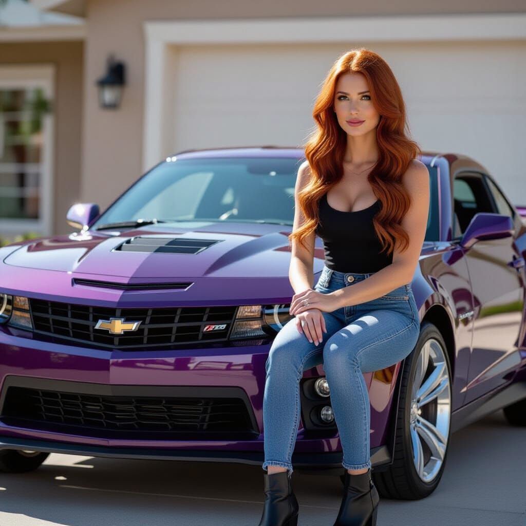 This image shows a striking woman with cinnamon red hair sitting on the hood of a violet Chevrolet Camaro ZL1. The picture uses crimson hues to enhance the vibrant colors.