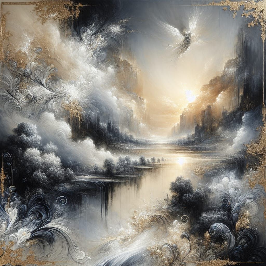 A striking picture of an oil painting featuring delicate brushstrokes and fine gold leaf. The artwork evokes a peaceful spirituality with morning light, detailed matte painting, and deep colors in 8k resolution.