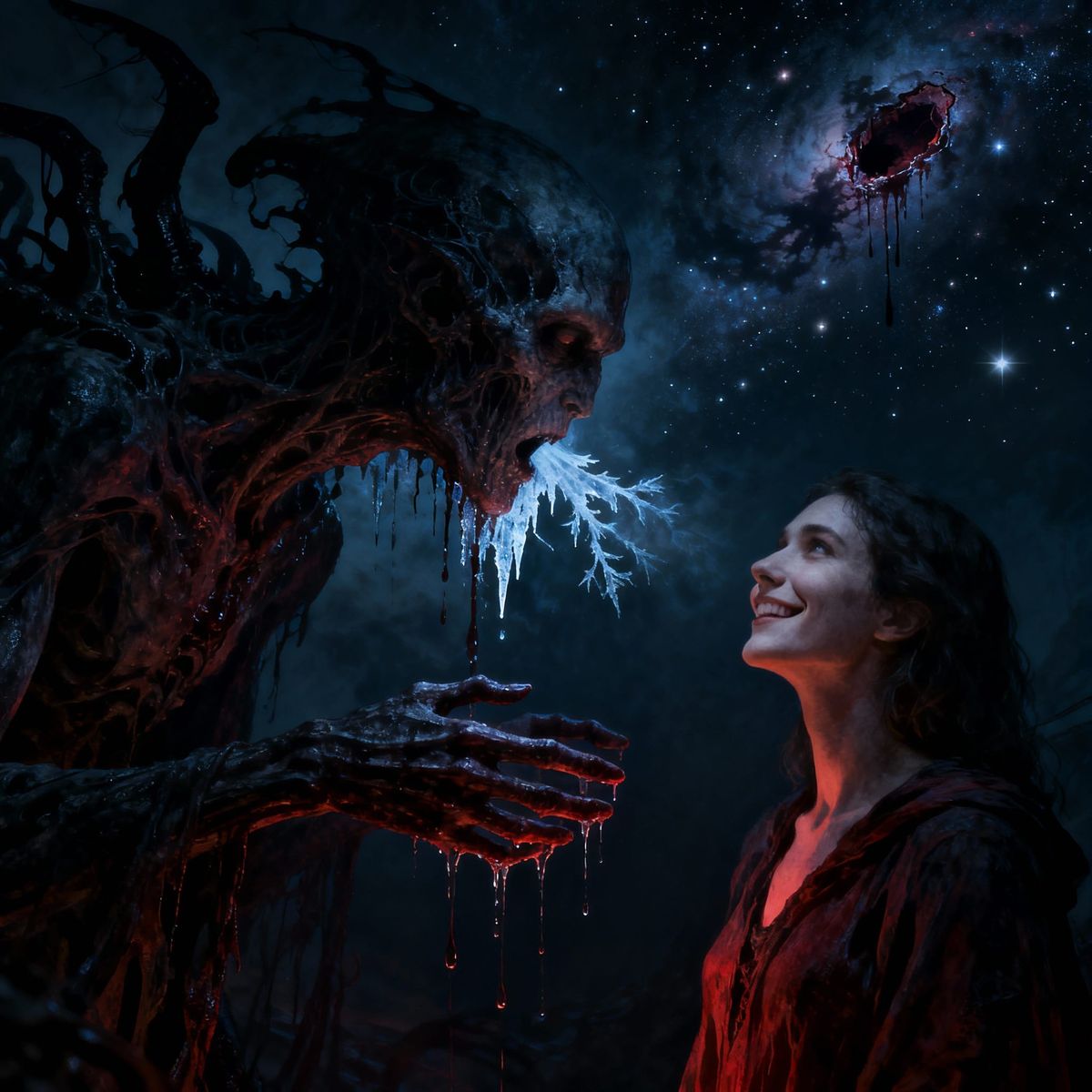 This image depicts a cosmic horror entity emerging from a wound in the night sky, whispering secrets to a figure. Rendered in a dark, surrealist style with dramatic lighting, it features vivid, contrasting colors.