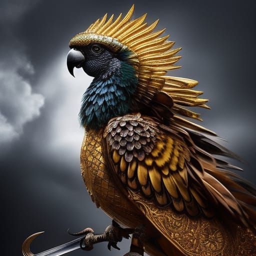 This image shows a detailed pencil sketch of a woman dressed as a pirate, complete with parrot, ship and treasure. The portrait features highly reflective surfaces and intricate details in a fantasy style.