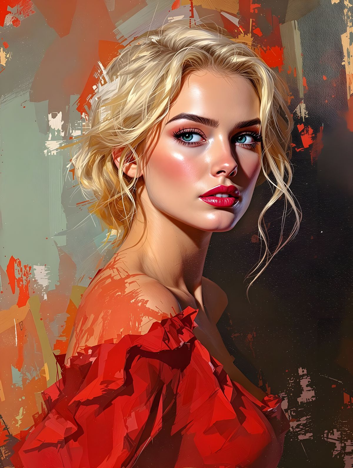 A vibrant, expressive portrait of a blonde woman in a red dress against a soft, abstract backdrop, created with dynamic brushstrokes and theatrical lighting, evoking a sense of artistic sophistication and Impressionist flair.