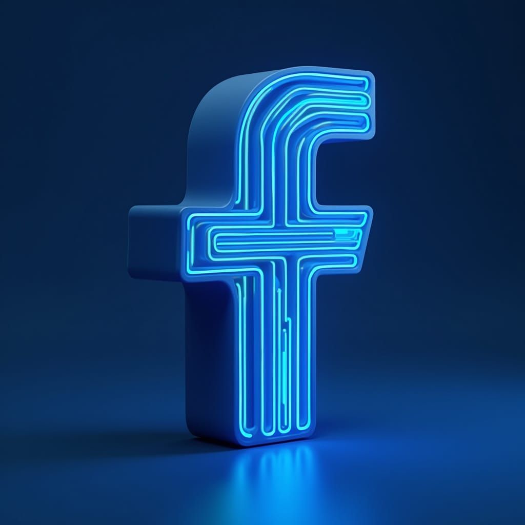 This image shows a futuristic Facebook logo with sleek lines and advanced geometries, set against a dark blue and green neon background, inspired by the works of Syd Mead, Ash Thorp, and Simon Stalenhag.