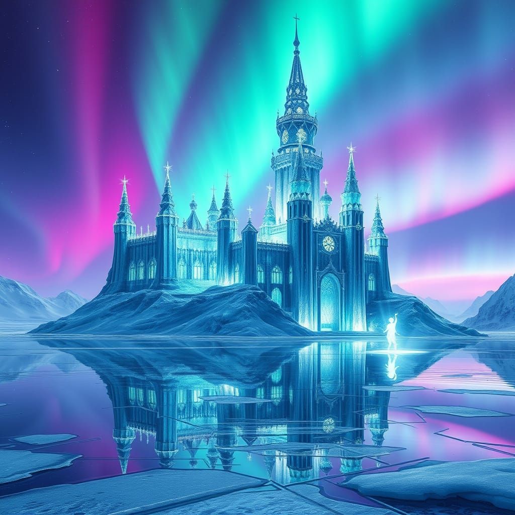 This breathtaking image depicts a majestic elven crystal castle set against the vibrant backdrop of the aurora borealis, its delicate spires and turrets reflecting off the icy terrain in shimmering blues and violets. Soft, luminescent rays dance across the frosty landscape, infusing the atmosphere with a...