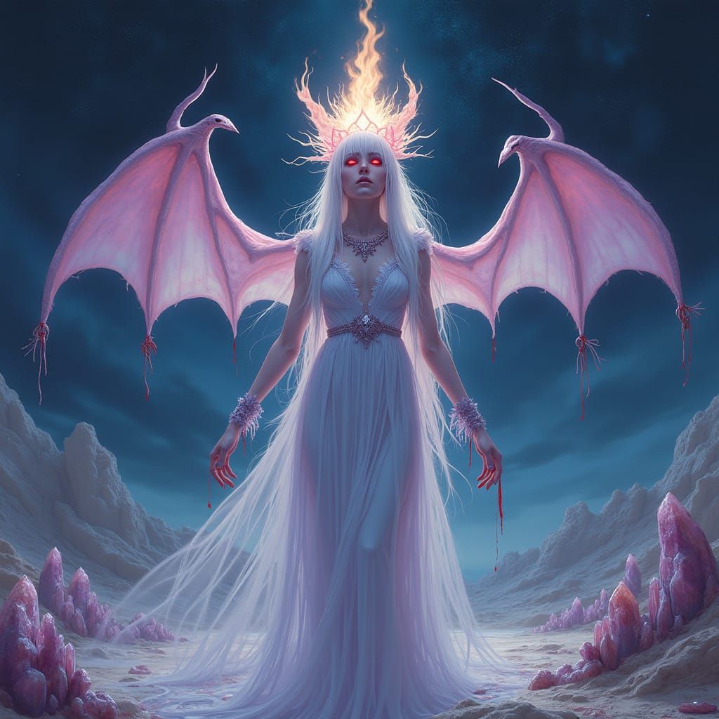 A striking picture of an albino queen with bat wings in a surreal, dark fantasy setting. She stands in a crystal desert with floating snakes, wearing a translucent dress and flaming crown, rendered as digital art.