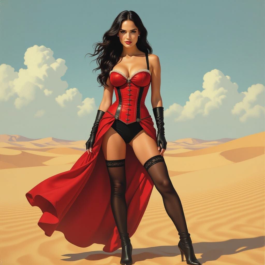 This image shows a woman with dark hair in a red Victorian corset, stockings, and suspenders, posing on Tatooine. The image has art nouveau and pulp fantasy influences.