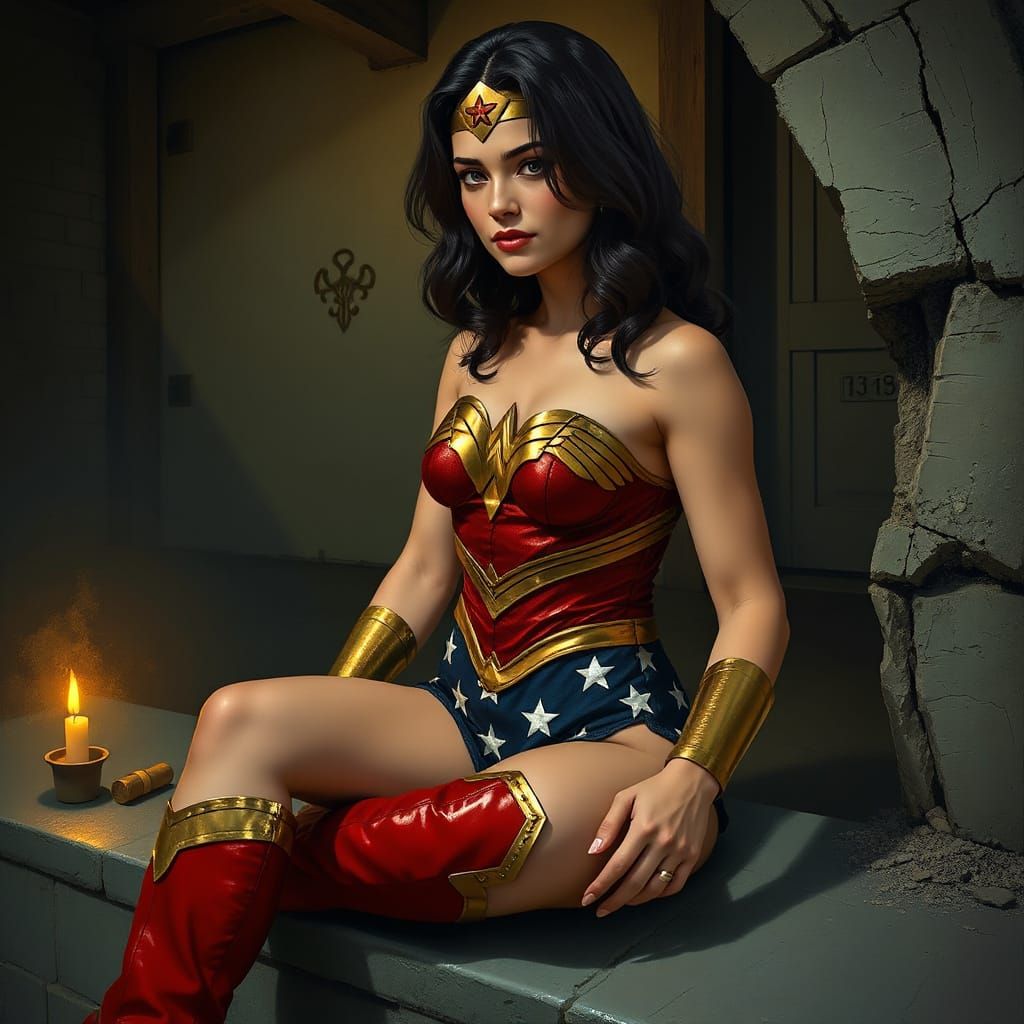 A striking illustration of a woman, inspired by Wonder Woman, sits in a dimly lit secret chamber, gazing into the shadows with a tense and wary expression, her sharp eyes reflecting uncertainty and quiet determination.
