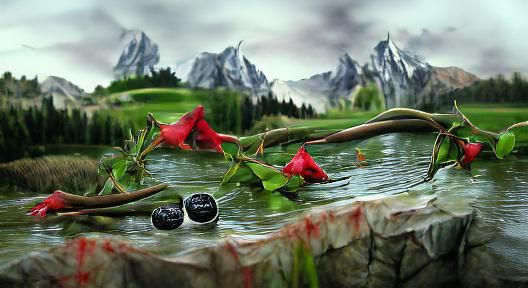 A hyperrealistic image of thorns and roses beside a pond. The background features a mountain landscape in the style of a matte painting.