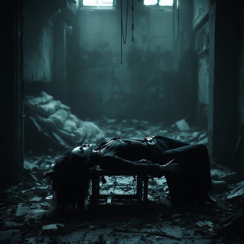 A dramatic digital painting of a mime lying on a derelict electroshock table in an abandoned asylum. The artwork is meticulously detailed with a sinister, cinematic atmosphere.