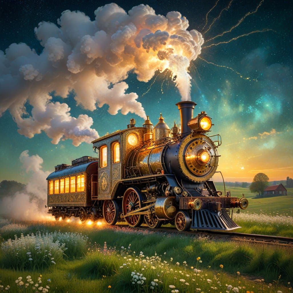 This image shows a vibrant steampunk steam engine train passing through a lush spring meadow, surrounded by billowing steam clouds and intricate, hyperdetailed cottages, grazing cows, and a whimsical, pointillist-style landscape in a dramatic, spotlight-inspired aesthetic.