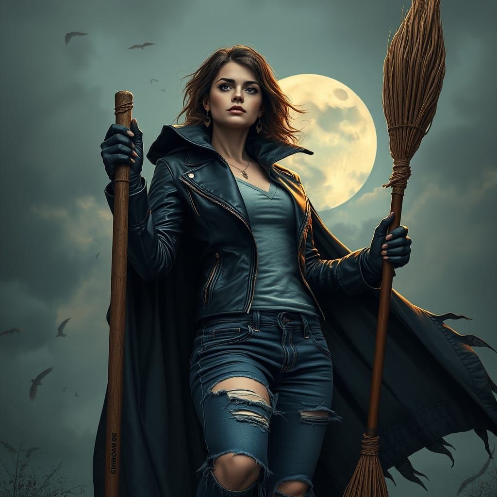 A super-powered woman in a tattered cape holds a broom to the sky in this dystopian-style image. The artwork features gritty textures and a dark, cinematic aesthetic.