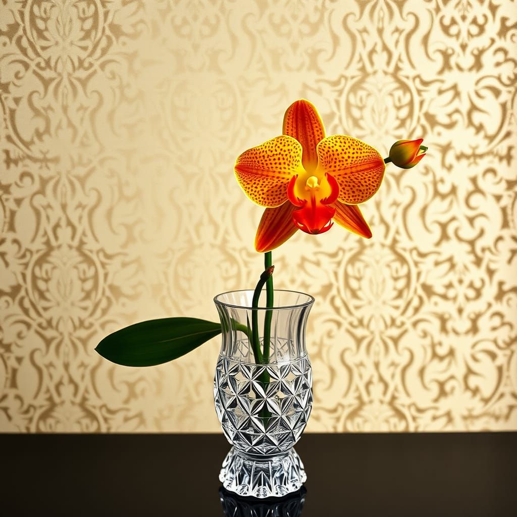 A striking picture of a vibrant orchid in a crystal vase, set against a detailed lace background. The image evokes a dreamy, romantic art nouveau style with lush botanical details.