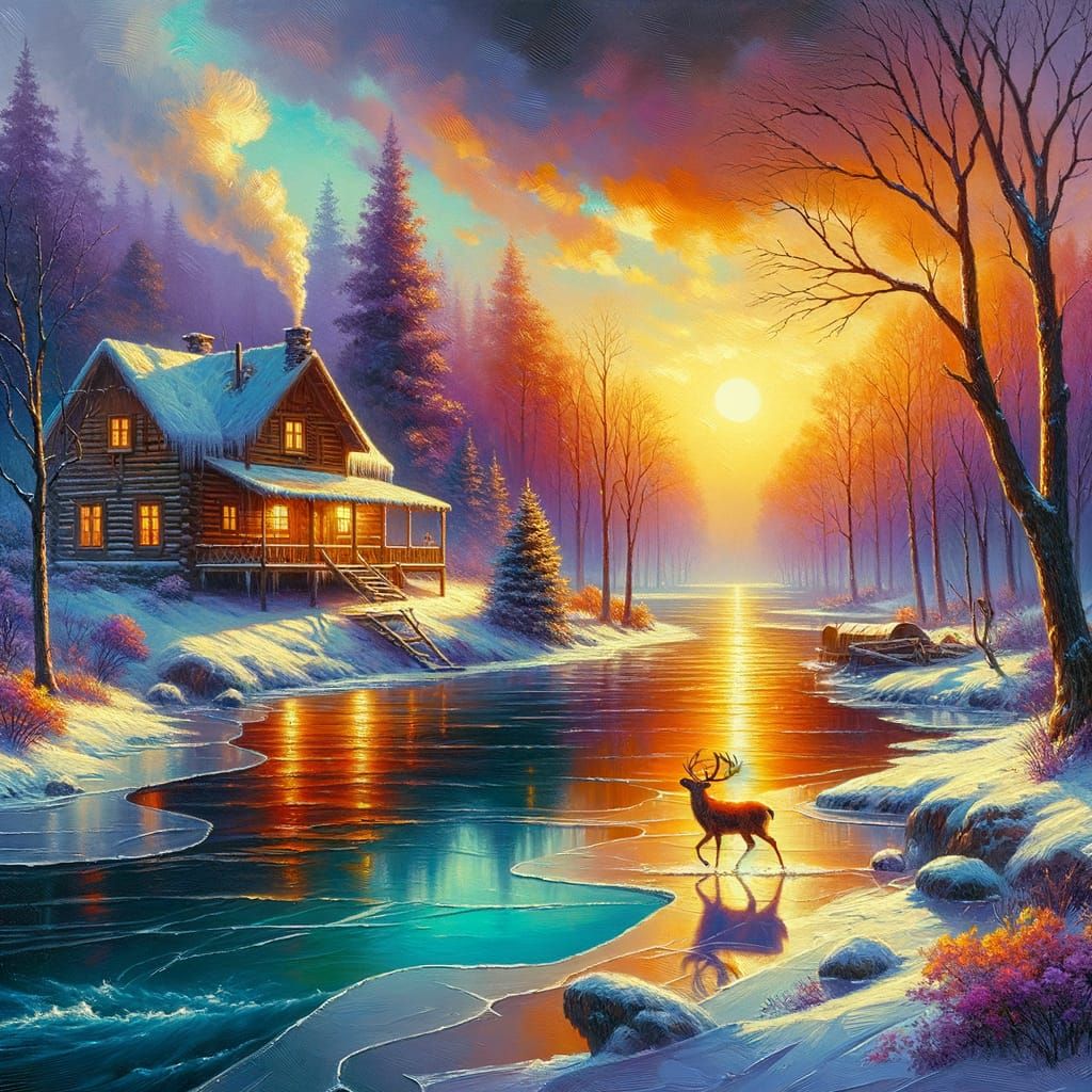 A striking picture of a winter river scene with a cabin emitting smoke and a deer crossing the ice, all bathed in the warm glow of a setting sun. The image is rendered as an impasto oil painting.