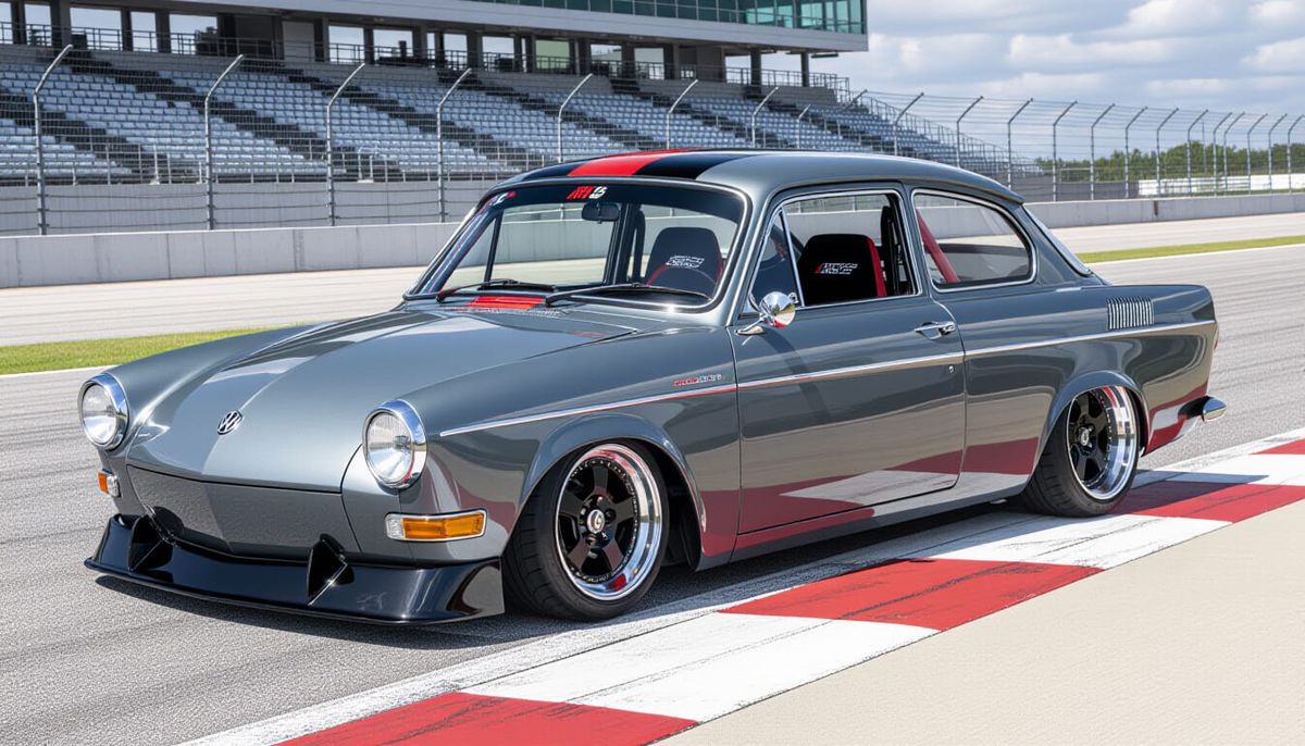 This image showcases a modified 1964 Volkswagen Type 3 Notchback. It features a metallic gunmetal gray finish, black and red stripes, modern LED lights, and Porsche-style wheels, set within a racetrack paddock.