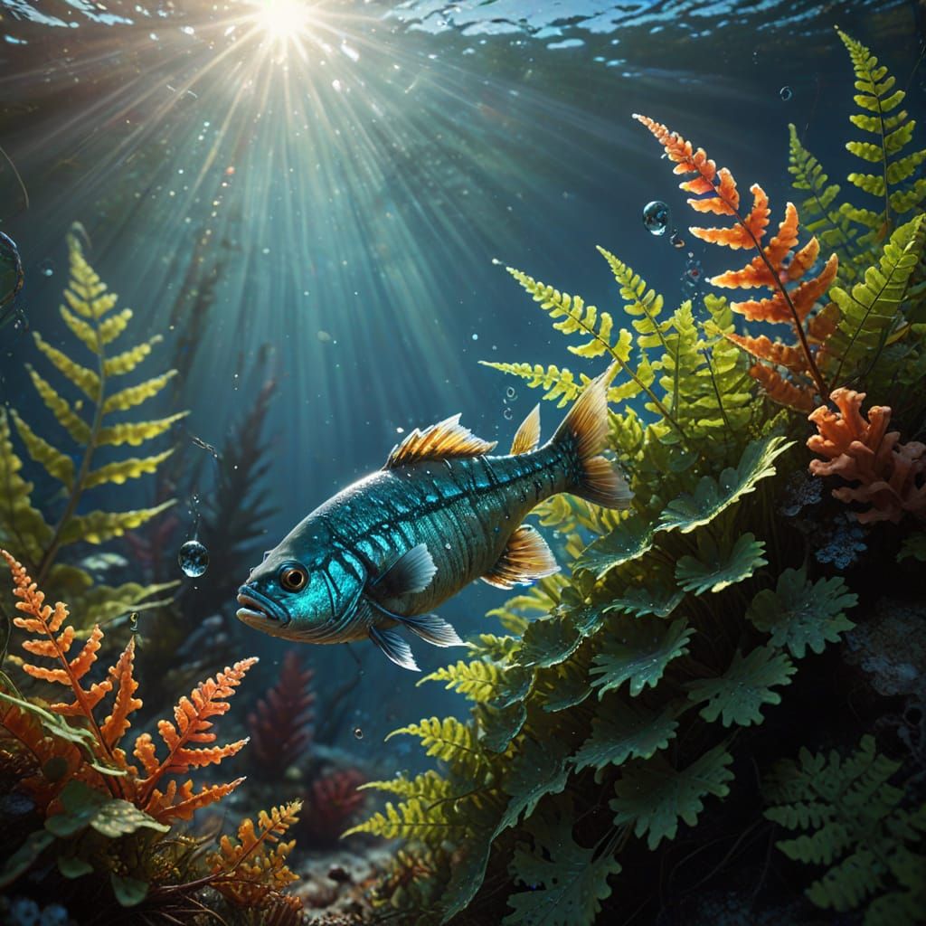 This stunning digital painting captures the beauty of a seer fish in its natural habitat, surrounded by vibrant coral, sea-fern, and colorful plant life. With meticulous detail and bold brushstrokes, the artwork transports viewers to an underwater world of breathtaking wonder.