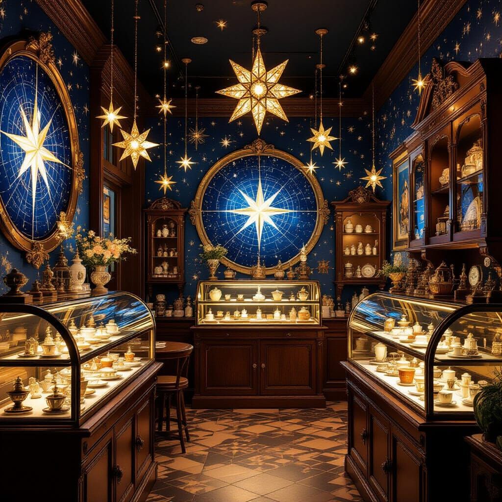 This digital art depicts a cozy cafe adorned with celestial elements like constellation maps and star lights, featuring antique jewellery displays in a steampunk fantasy style.