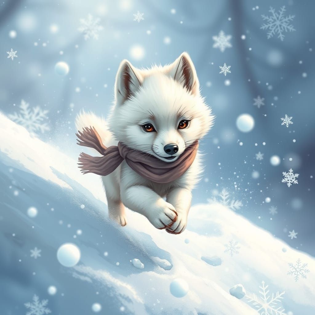 This image shows a fluffy white wolf cub joyfully playing in sparkling snow, adorned with a small scarf. The scene is rendered in a hyper-realistic and ultra-detailed comic book style.
