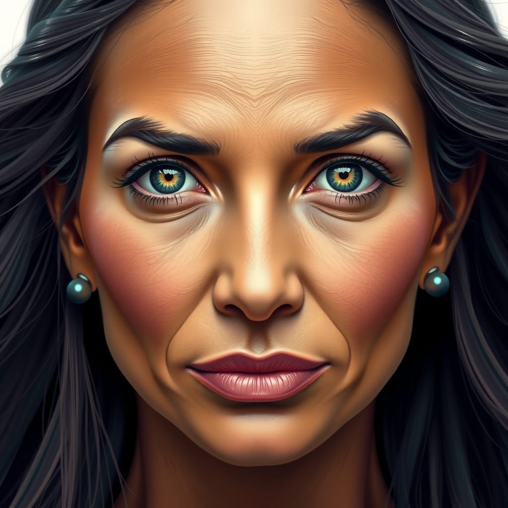 This image showcases a hyper-realistic portrait of a wise woman with a diverse range of ethnic features, radiating trust, wisdom, and deep empathy. Her calm expression exudes inner peace and kindness, with intricate details and realistic depth.