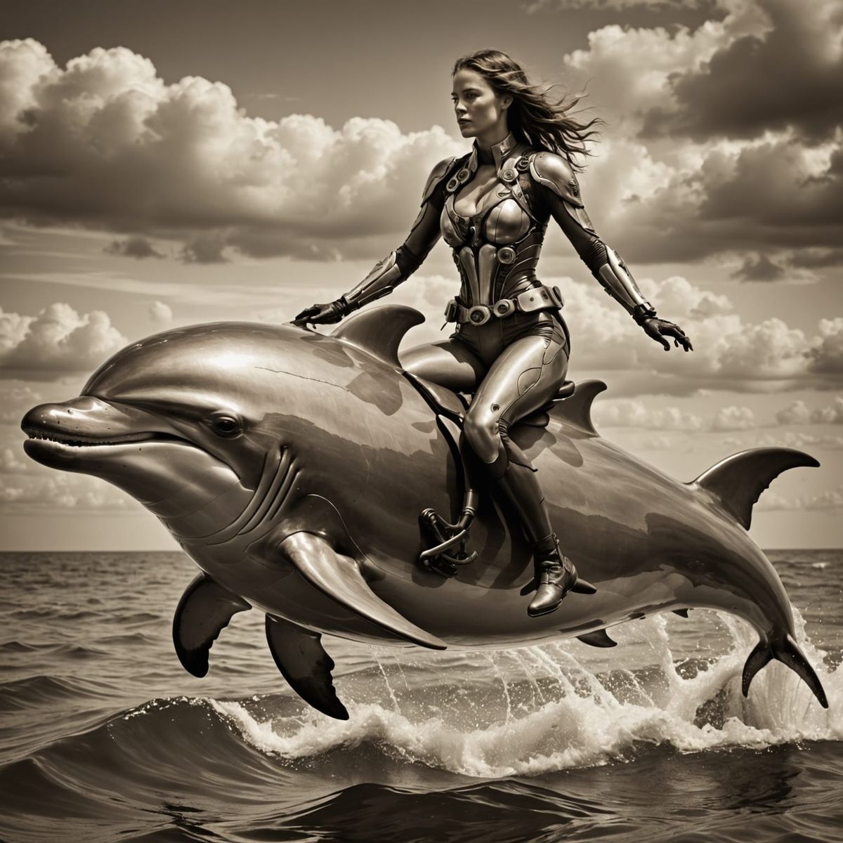 This hyperrealistic image showcases a cyborg woman riding a dolphin. Shot with HDR and sharp focus, it features high contrast, a moody atmosphere, and perfect composition.