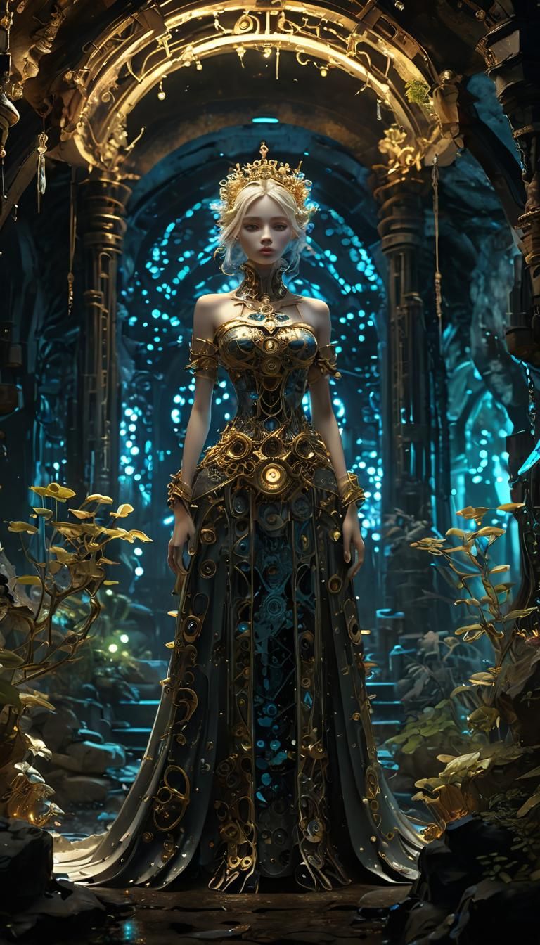 This image shows a mechanical princess in an anime style, with porcelain skin and golden gears on her dress. The princess is in a mystical cavern filled with bioluminescent plants, as digital art.