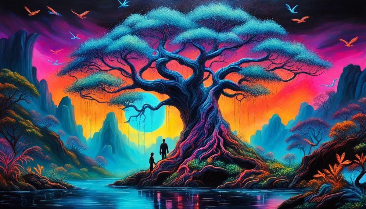 This image shows a Tree of Life glowing with bioluminescence as a man and woman observe. Animals fly around them in a harmonious, colorful, vibrant, ideal world, depicted as graffiti art.