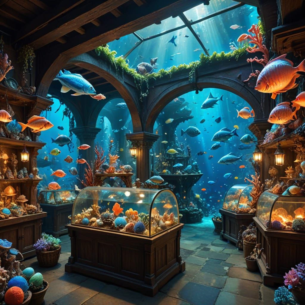 A vibrant underwater marketplace bustling with merfolk and humans trading exotic goods. Stalls made of pearl and shell display coral, fish, and artifacts in a Renaissance style.