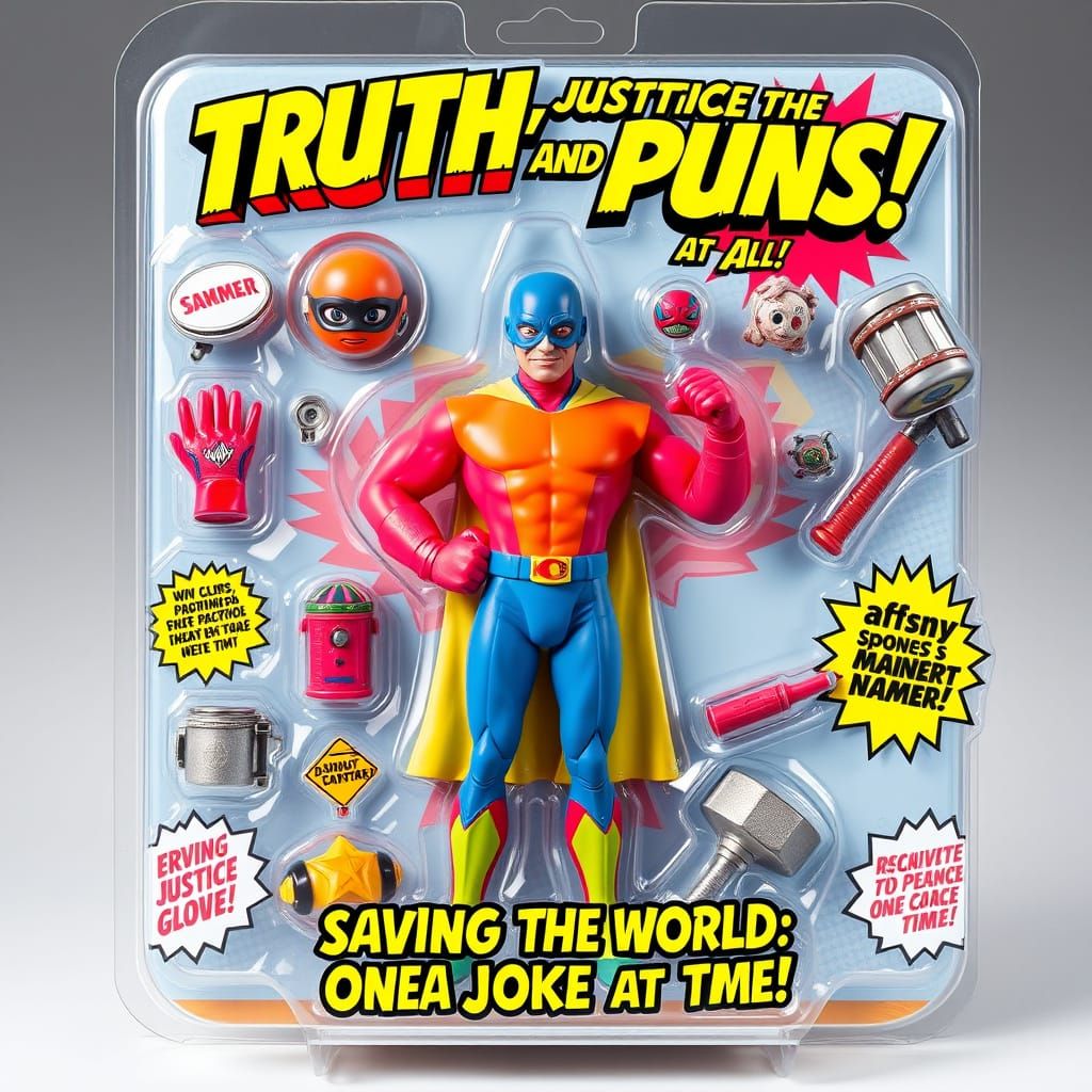 This image shows a tongue-in-cheek superhero in a colorful, photorealistic comic book style, surrounded by humorous, oversized accessories and bold, comic book-style lettering, with a playful, exaggerated aesthetic reminiscent of classic comic book artwork.