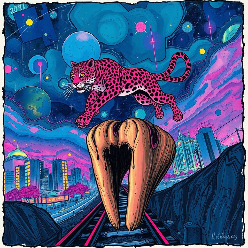 This striking image depicts a pink leopard in a surreal, cyberpunk world. It features bold impasto textures, dripping ink effects, and neon-lit cityscapes, blending European ink painting with vibrant illustration.