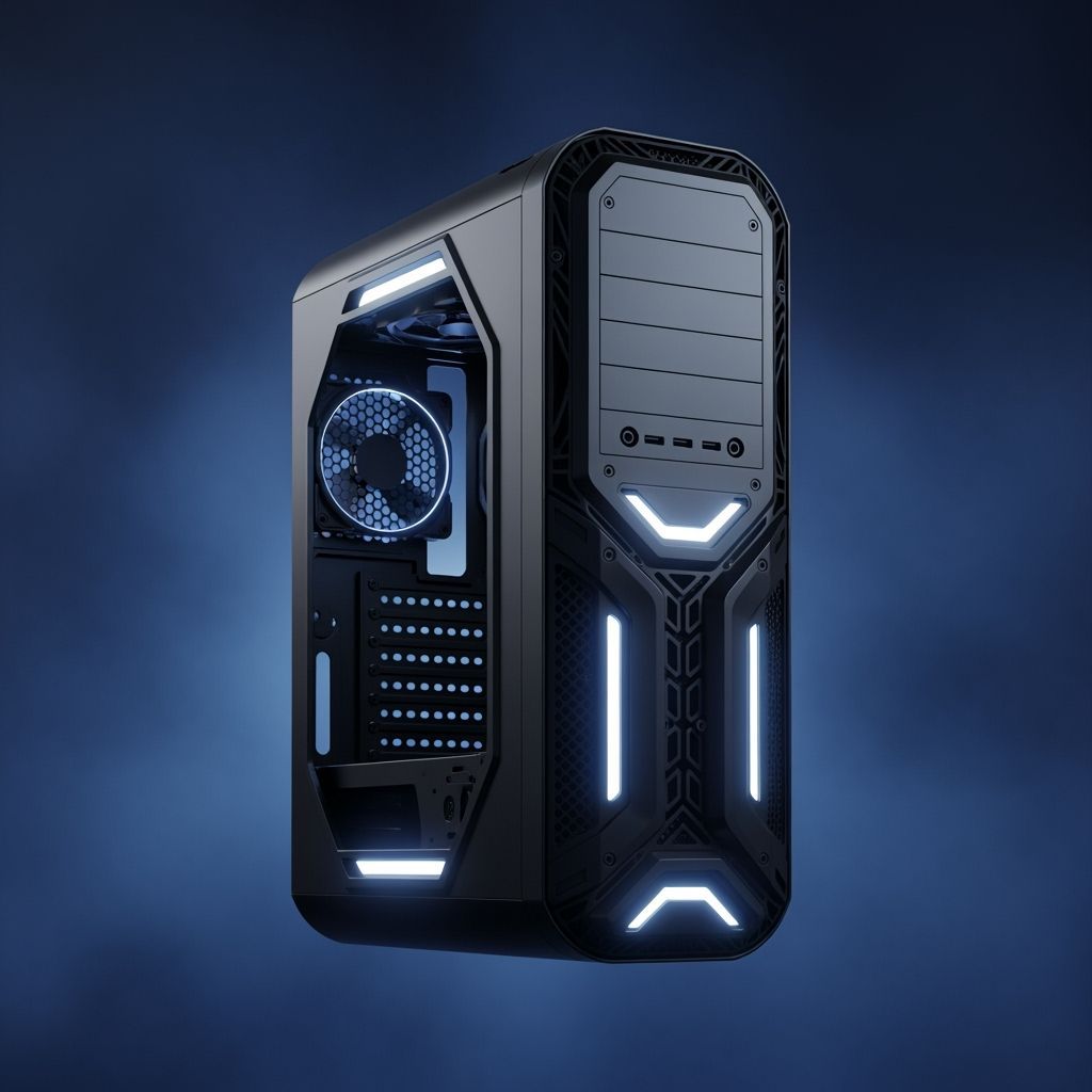 A case designed for a environment without gravity. No concern for "bottom" or "top." Vents and ports on all surfaces. A perfect geometric form (dodecahedron, cylinder) made of milled aluminum, floating in a deep blue void, with soft glow from within its vents.