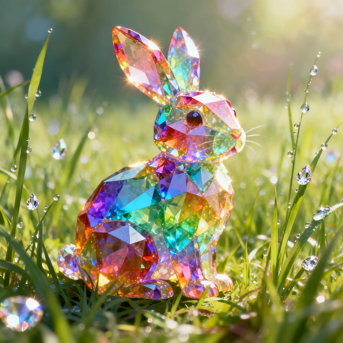 This whimsical illustration features a bunny crafted from translucent rainbow gemstones, set in a softly lit meadow with sparkling dewdrops, in a fantasy art style.