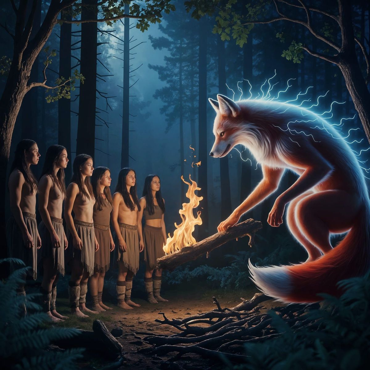 This image shows a celestial red fox presenting a flaming branch to a group of Blackfoot Native Americans in an idyllic forest. The tribe members gaze in wonder at this gift of fire.