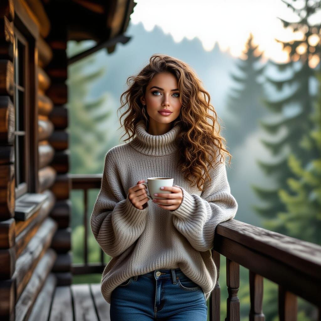 A striking picture of a woman with blue eyes standing on a wooden balcony. She holds a warm drink while surrounded by a misty forest, creating a serene and thoughtful scene in an impressionistic style.