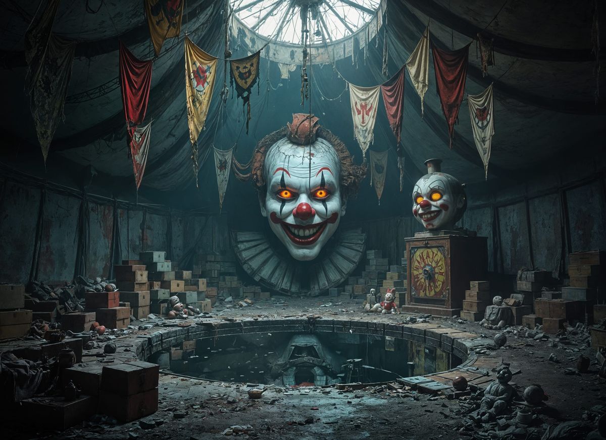 A dark, abandoned carnival tent interior featuring tattered banners, a murky pool reflecting a clown face, and dusty remnants. Cold moonlight illuminates the eerie scene.