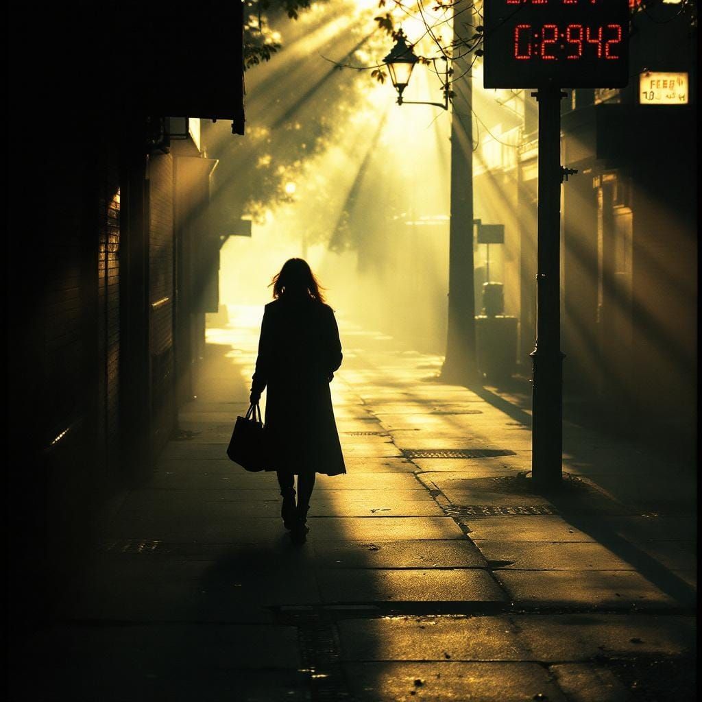 A striking image of a woman walking down a city street. The photograph is rendered with atmospheric layering, volumetric lighting, and luminous haze to create a sense of solitude and mystery.