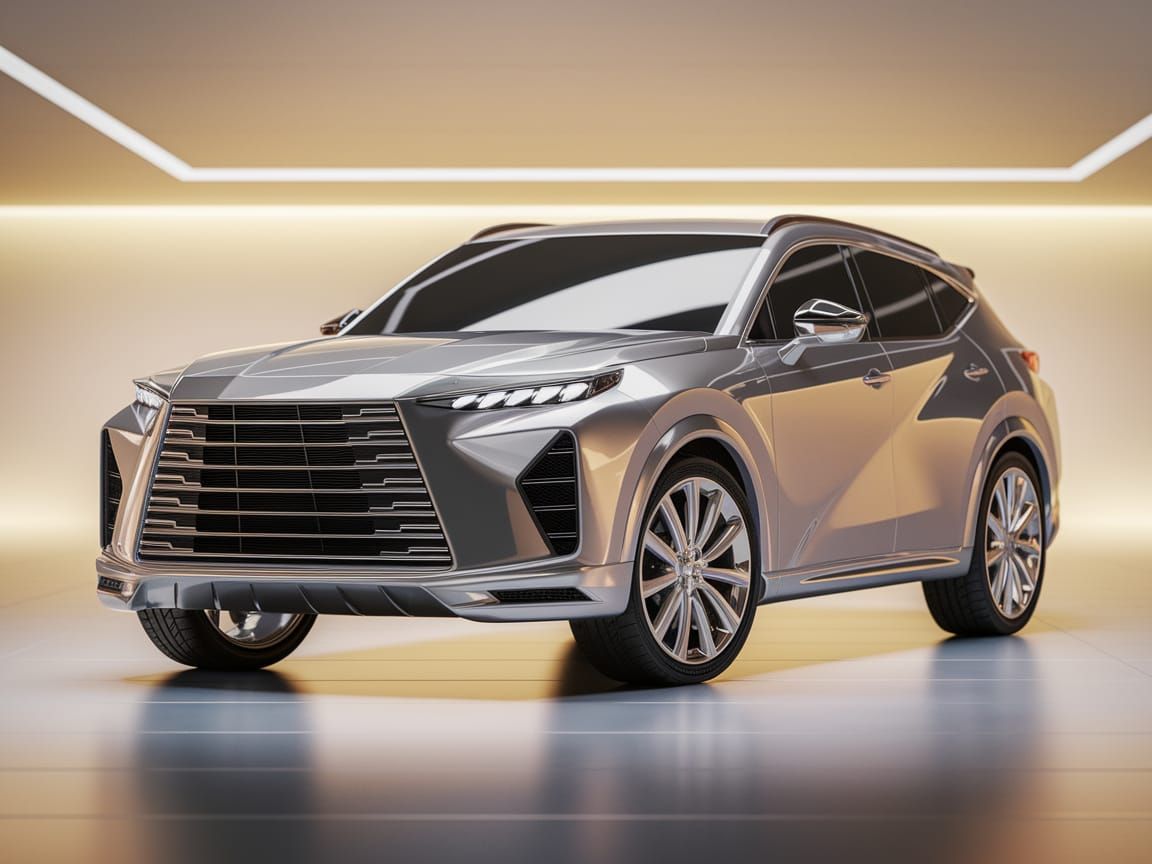 This image shows a futuristic luxury SUV in a sleek studio setting, featuring angular lines, metallic silver paint, and LED headlights in a 3D rendered digital art style.